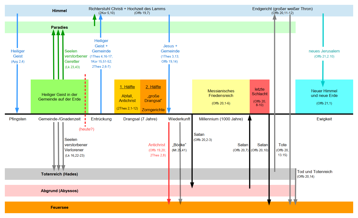Aktuell (Stand April 2026) befinden wir uns in dem nunmehr fast 2000 Jahre andauernden Gemeinde- bzw. Gnadenzeitalter, in dem jeder Mensch die Möglichkeit hat, zu Gott umzukehren, das Geschenk der Gnade anzunehmen und dadurch für die Ewigkeit gerettet zu werden. Danach wird dies wesentlich schwieriger und vielleicht sogar praktisch unmöglich werden. Wir wissen nicht, wie lange das Gemeindezeitalter noch andauern wird, aber die in der Bibel angekündigten Vorzeichen des Endes dieses Zeitalters treten immer deutlicher zutage (Jesus nannte dies "Wehen"; vgl. z.B. Matthäus 24,8), so dass ich glaube, dass wir kurz vor dem Ende des Gemeindezeitalters stehen (siehe die gestrichelte rote Linie in obiger Grafik) und dass die Entrückung nicht mehr allzu lange auf sich warten lassen wird. Darum meine Empfehlung: