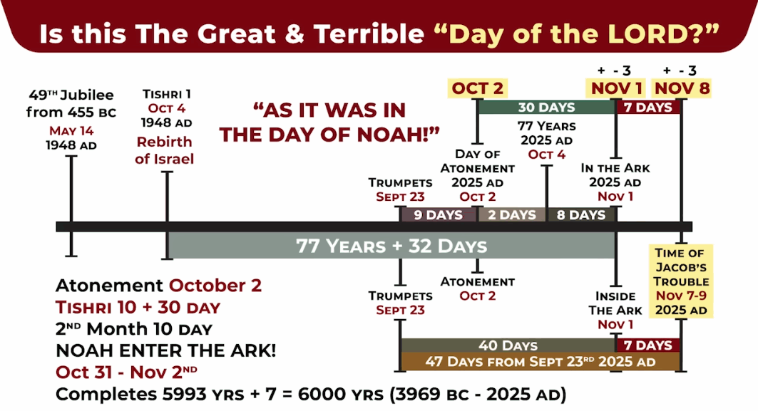 Sieben Tage lang stand die Tür der Arche Noah noch offen, bevor die Sintflut kam und alles Leben außerhalb vernichtete. Könnte der 5. November 2025 innerhalb eines letzten 7-Tage-Zeitfensters vor dem Beginn der siebenjährigen Drangsalszeit liegen, in dem es noch möglich ist, sich in die rettende Arche (Jesus Christus) zu begeben?