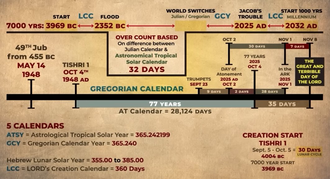 Gestern stieß ich auf ein YouTube-Video, wo jemand anhand des jüdischen "Sabbat-Kalenders" und prophetischen Angaben aus der Bibel Endzeit-Ereignisse auf den heute gebräuchlichen gregorianischen Kalender gemappt hat. So kam er z.B. für die prophetischen "sieben Tage", die Noah mit seiner Familie in der Arche wartete, bevor die Sintflut losbrach (siehe 1.Mose 7,4-10), auf die Zeitspanne 1. bis 8. November 2025: