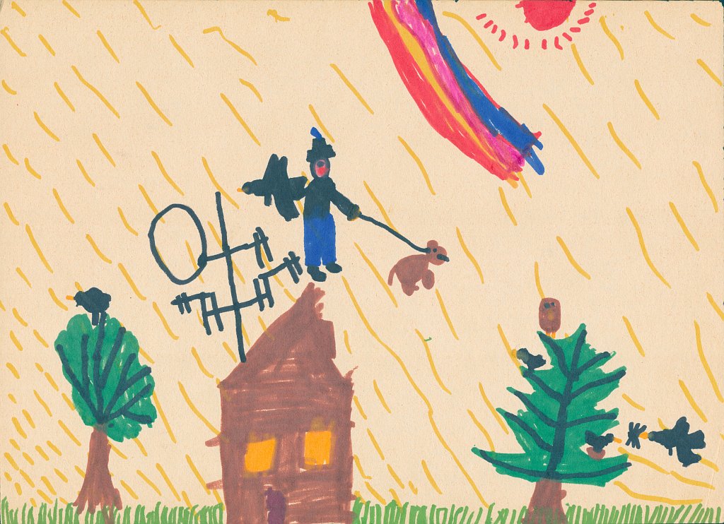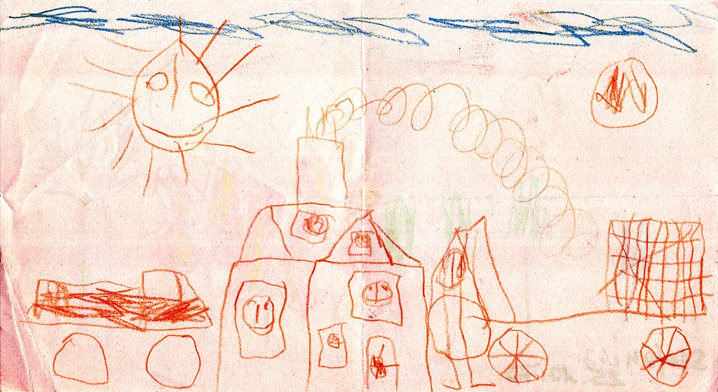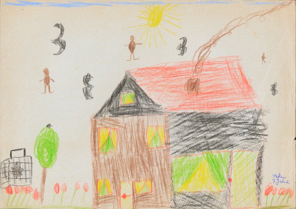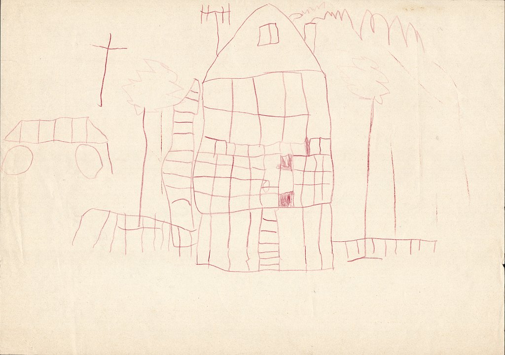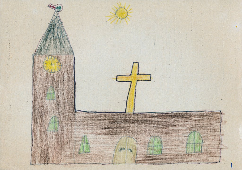 Bereits das allererste Bild in der „Häuser-Galerie“ zeigt oben links ein Kreuz, das da nicht so richtig hinzugehören scheint und das man auf dem Bild eines 5-Jährigen eigentlich auch nicht erwarten würde: