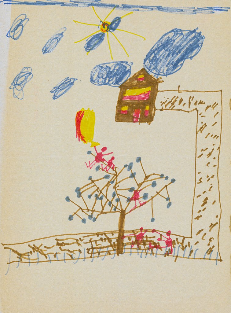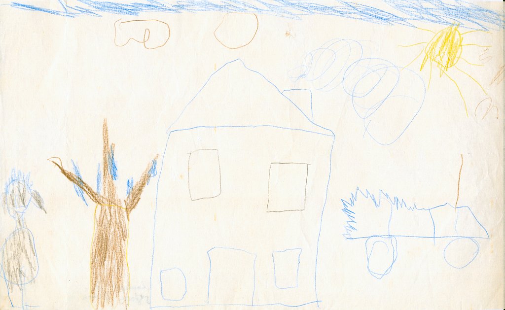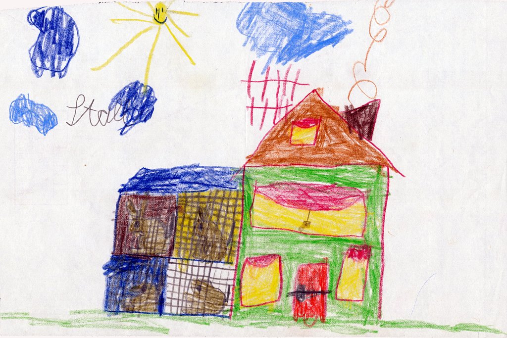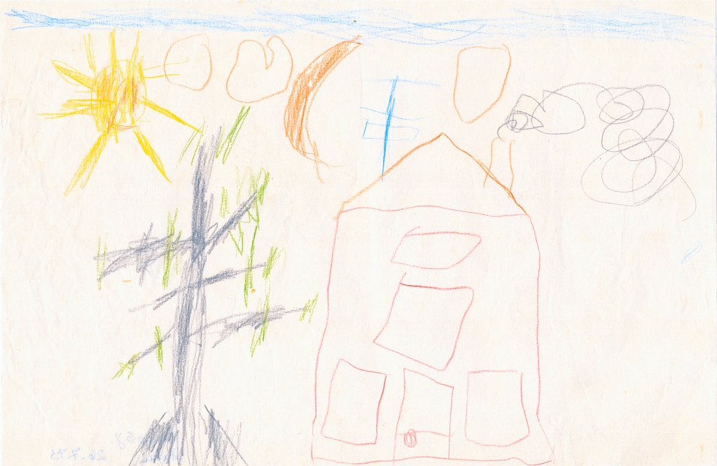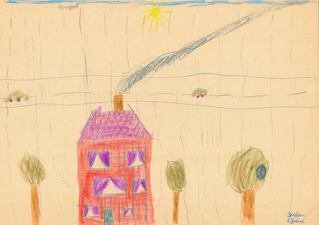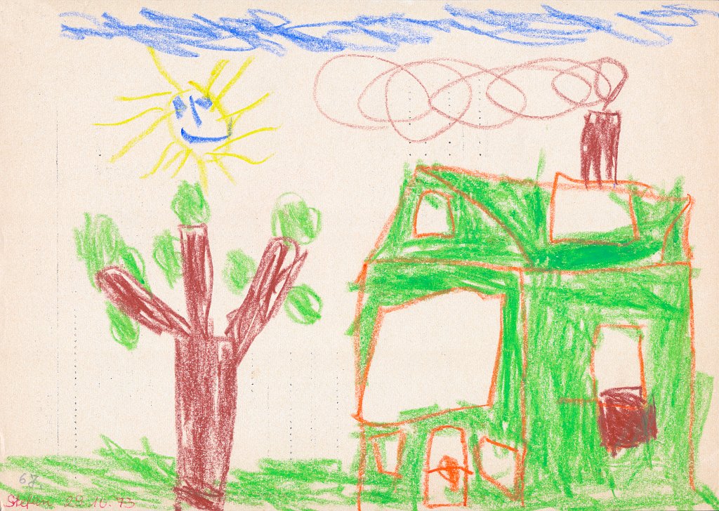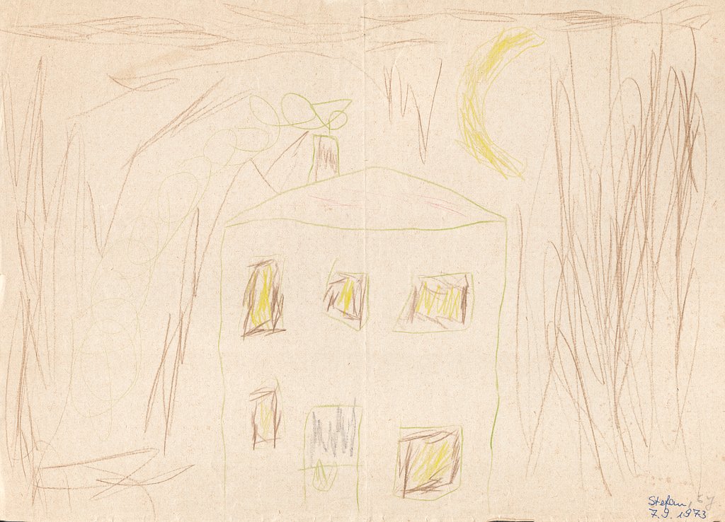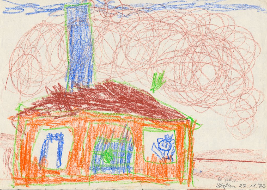 Kürzlich habe ich eine alte Kunstmappe mit Bildern gesichtet, die ich als Kind gemalt hatte. Ich habe dann sämtliche 86 Bilder eingescannt und mit einem Datum im Dateinamen versehen, um sie leichter in eine zeitliche Reihenfolge zu bringen. Danach habe ich die Bilder in Kategorien eingeteilt wie z.B. Häuser, Bäume, Figuren, Personen, Gegenstände oder Szenarien. Häuser scheine ich besonders gerne und oft gemalt zu haben - mehr als 20 Bilder zeigen ein Haus - meist mit rauchendem Schornstein, manchmal mit Fernseh-Antennen auf dem Dach, aber fast immer zwischen zwei Bäumen oder neben einem Baum. Und immer ist der Himmel ein schmales blaues Band am oberen Bildrand und die ist Sonne gelb mit Strahlen und lachendem Gesicht.🌞