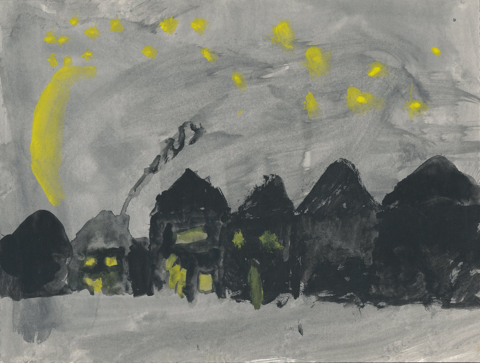 Auf diesem Bild ist es Nacht, der gesamte Bild-Hintergrund ist grau, die Häuser schwarz. Nur in einigen Häusern scheint Licht: