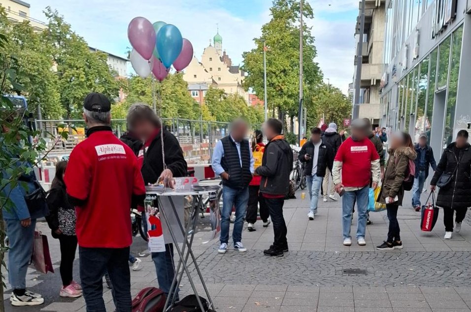 Die Straßenaktion verlief dann auch sehr gut und es fiel mir erstaunlich leicht, mich mit den Passanten zu unterhalten und sie zum Alphakurs einzuladen. Zwar war etwa die Hälfte ablehnend oder ignorierten uns, aber wir konnten auch etliche Einladungsflyer und "Goodies" verteilen. Dabei stellte ich mir vor, dass nicht ich da stehe, sondern Jesus, den ich (gemäß Römer 13,14 und Galater 3,27) "angezogen" hatte, so wie das rote "Alphakurs"-T-Shirt, das wir alle trugen.